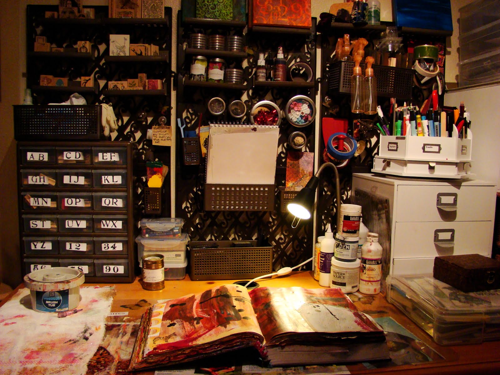 This is my lovely newly organized home studio space. I have all my favorite supplies in drawers, everything is labeled and put in clear boxes. My BIG juicy journal is out on my desk and ready for inspiration. I was so inspired I created my new banner for this blog..."visual communication". Yep that banner was made in my new studio.